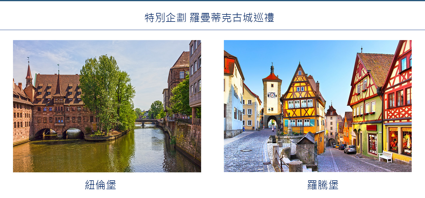 上午抵達德國,今日我們將依各位貴賓搭乘的航空公司安排參觀位於德國浪漫大道上的千年古城。之後,均將前往紐倫堡住宿一晚,準備明日登上美麗的 S.S. Emilie 。