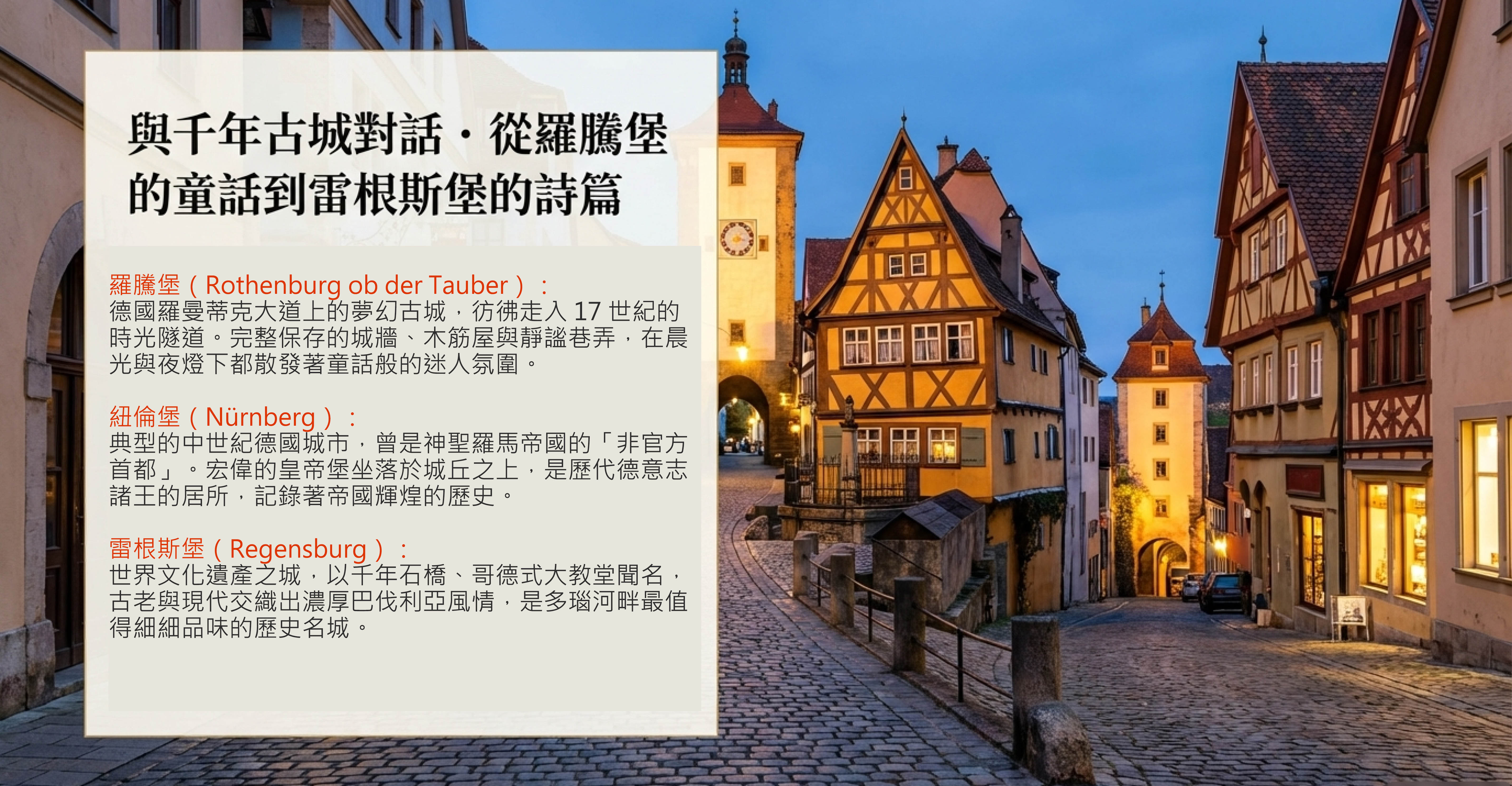 位於德國南部巴伐利亞州西北側邊緣的羅騰堡,全名 Rothenburg ob der Tauber,意為「陶伯河上的羅騰堡」。這座保存完好的中古世紀小鎮,是德國「羅曼蒂克大道」與「古堡大道」上的重要景點之一。羅騰堡以古色古香的街景聞名,紅色屋頂的房舍交織出宛如定格於 17 世紀的氛圍。遊客在一日遊行程中,必訪的景點包括 市場廣場與市政廳、普連萊小廣場、環繞古城的城牆,以及城堡公園。穿梭於蜿蜒的大街小巷,欣賞獨具魅力的建築風貌,便能深刻體會「羅騰堡」名稱的意涵——「紅色屋頂的城堡」。
