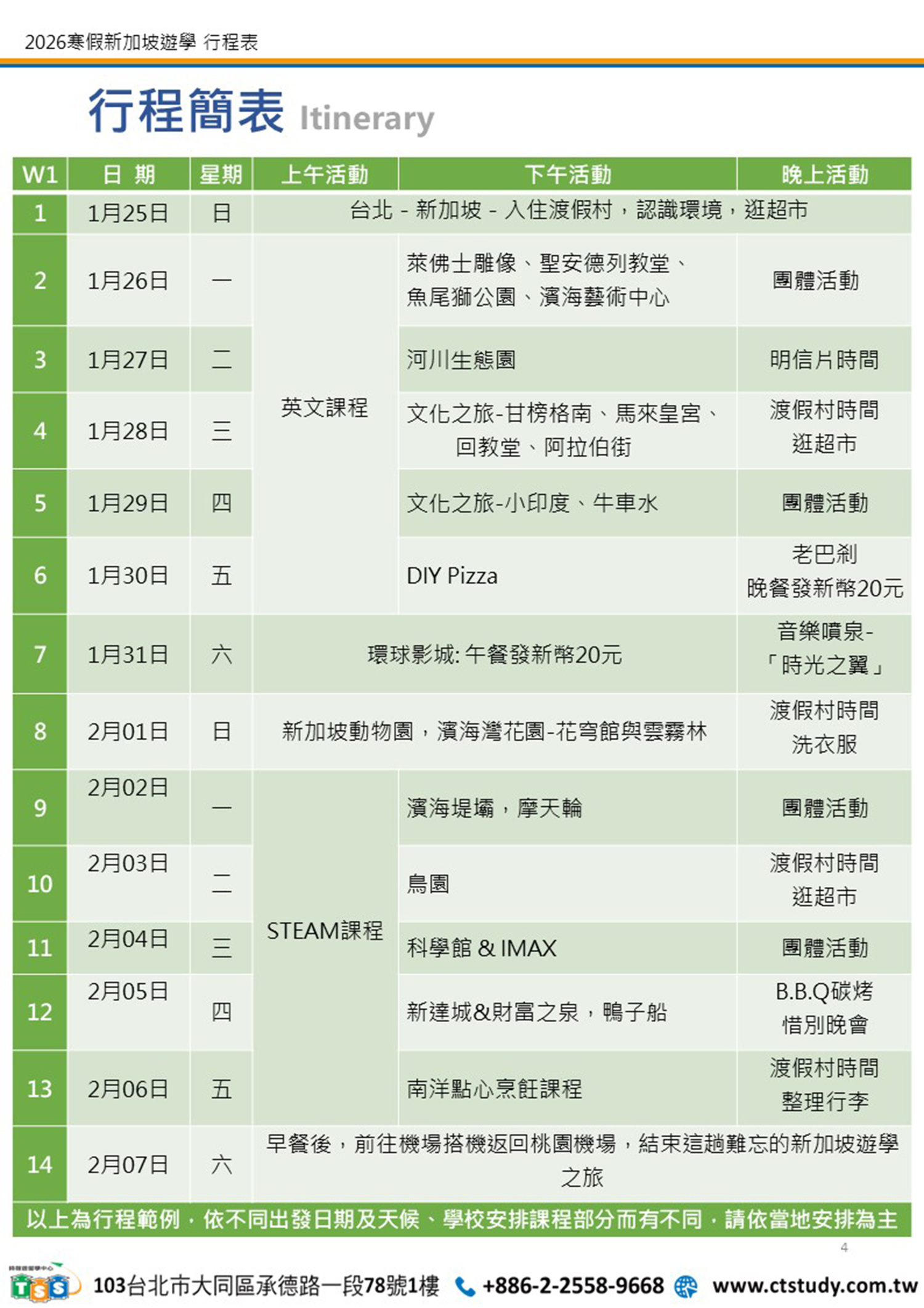 ⦿ 所有的課程 / 行程活動,依不同出發日期及天候、學校的課表為主。