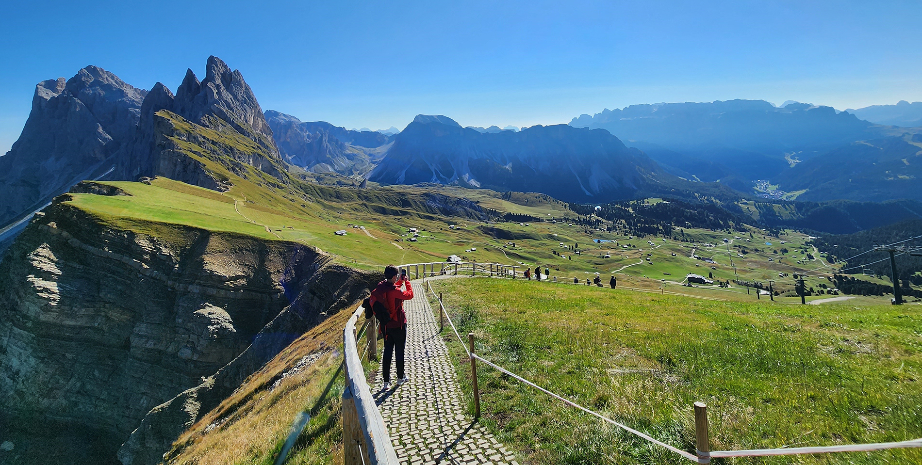 嘉德納山谷周圍環繞著令人歎為觀止的山峰和風景如畫的草地,世外桃源般的小鎮和傳統手工藝品商店,交織出遊客的戶外天堂。★纜車探訪歐洲最大的高山天然牧場,遠方Sassolungo群山彷彿與腳下綿延的草地相連,營造出充滿柔和的對比,遍地野花點綴時而出現的木造小屋,享受最悠閒的時光。續搭乘★纜車直上海拔2,500公尺的觀景平台,遠處塞達奧德萊山群Secëda Gruppo delle Odle襯托近處奇特鋸齒狀的刀鋒山,山勢陡峭、地形嚴峻,夏日裡綠意盎然,欣欣向榮,宛如上帝自然傑作。