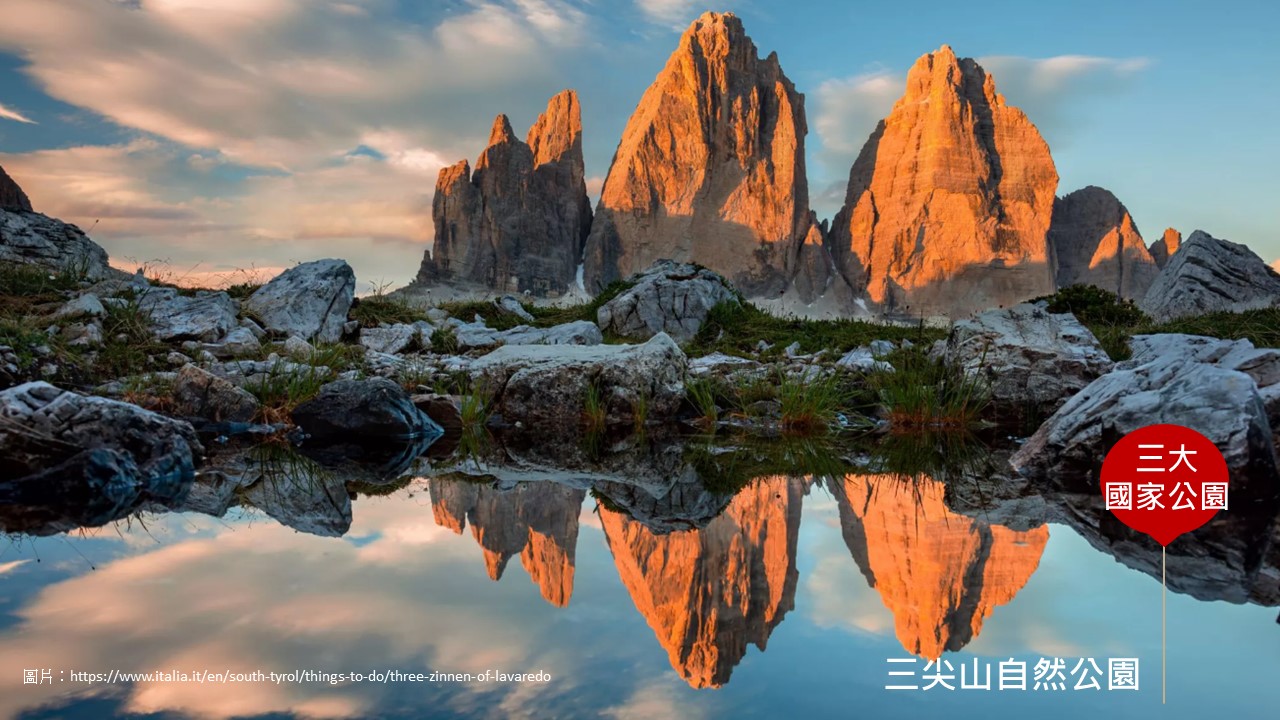 世界上最具吸引力的多洛米蒂山區佈滿2,000~3,000公尺的高山,在冰河侵蝕下,高聳壯觀的山峰、垂直裸露的尖石,間或與森林草地提供豐富的色彩。曾為一戰戰場的三尖山自然公園,其主峰三尖山為3個獨立山頭,成為多洛米蒂山脈最具代表性的標誌,亦是聯合國教科文組織世界自然遺產多洛米蒂山脈的象徵。從位於海拔2,326公尺的奧隆佐小屋,途經遺世獨立的天際小教堂、緩步前往海拔2,345公尺的拉瓦雷多小屋,挑戰海拔2,454公尺的三尖峰北坡,領略大自然的鬼斧神工。