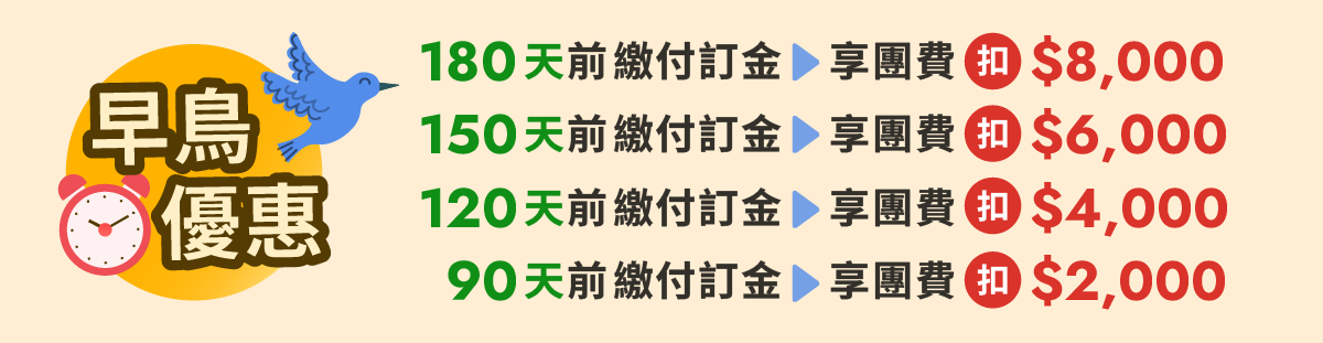 ※ 本行程未包含領隊、導遊與司機的小費,敬請依國際慣例酌予支付:每位貴賓每日小費為美金USD12元 × 旅遊天數。