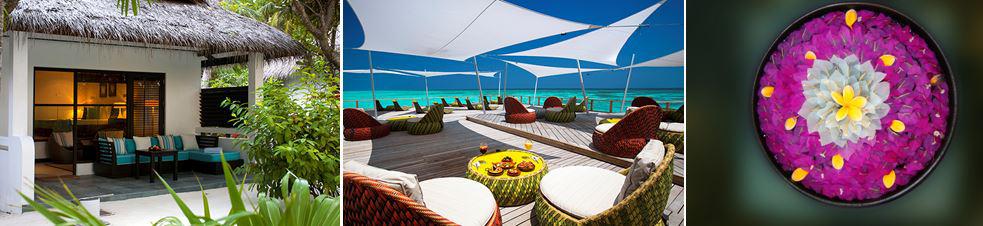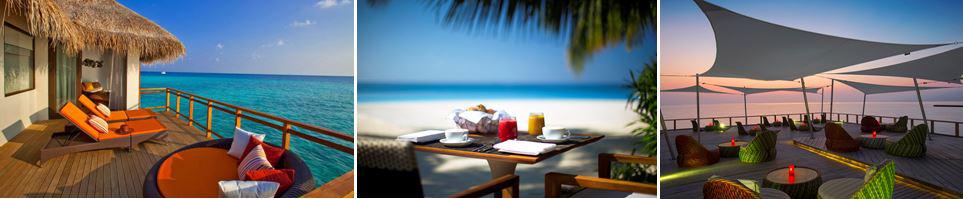 房間均面海或礁湖,開放式的大陽台有沙發和小桌子,前方就是熱帶的椰樹與軟細的白沙,沙灘上擺著數張躺椅。房內經過富有品味的安排和高級的裝潢,浴室寬敞舒適。茅草屋頂的度假套房由陽台進入,一張King Size的大床就擺在房間的正中間,而兩旁一邊是小型酒吧,一邊是沙發和茶几,床鋪的後方有一張辦公桌。房間設有King Size的大床、小型酒吧、茶/咖啡電壺、LCD電視和DVD播放器、i Pod連接器、露天花園的浴室、室內的淋浴及浴缸、兩張梳妝台、精緻的梳妝品等。